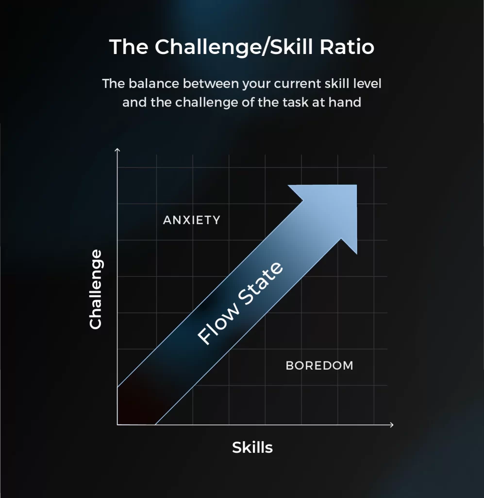 To experience flow, there has to be a balance between your skill and the demands of the task you’re doing. Actively seek challenging tasks that push the boundaries of your abilities until you reach the skill/challenge sweet spot—what we refer to as the challenge/skill ratio